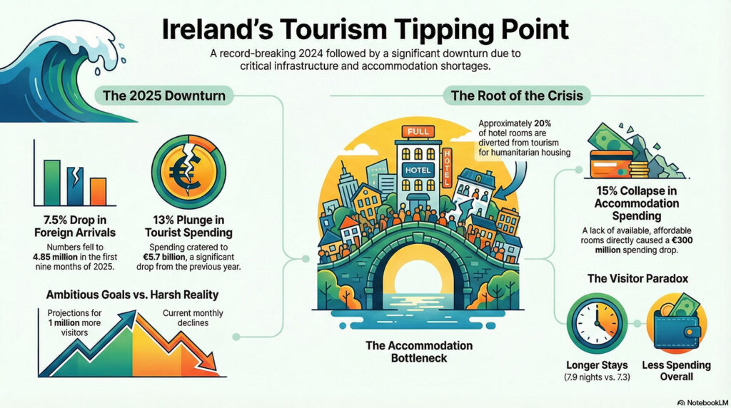 The real villain in this narrative isn’t the demand, it’s the supply. Specifically, beds. Ireland’s accommodation crisis has transformed from inconvenience into an existential threat, with roughly 20% of hotel rooms diverted to humanitarian housing. When 654,500 visitors arrived in June 2025 (down 2% from June 2024), they discovered a country stretched thinner than rashers on a breakfast plate. This situation mirrors the global visitor decline of 30% that has triggered economic shockwaves across tourism-dependent regions worldwide.