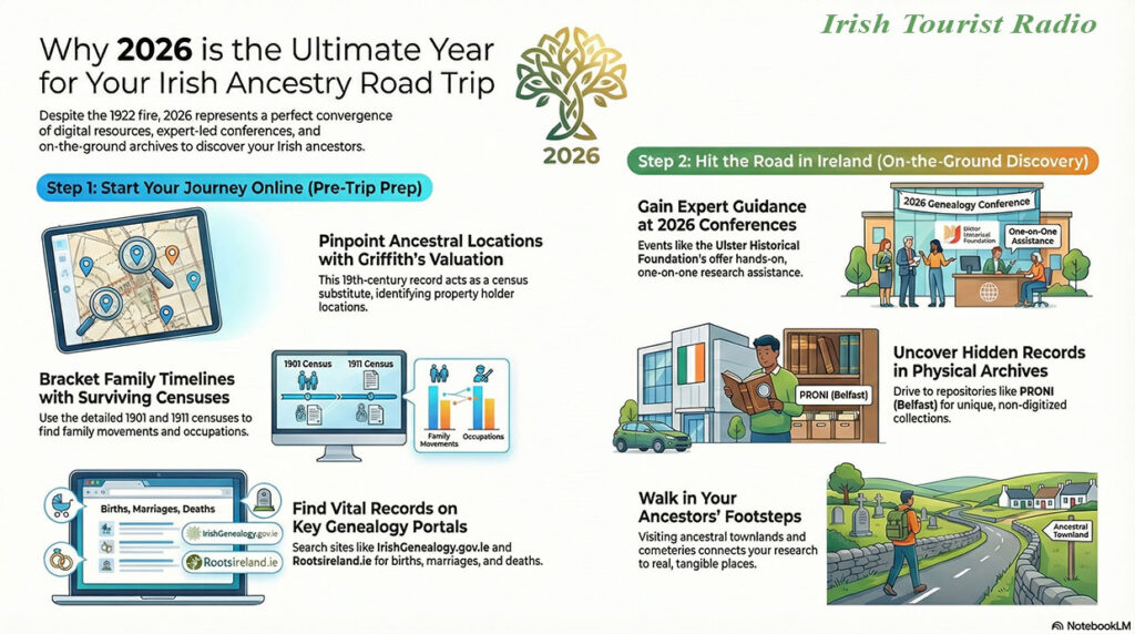 Whether you’re just beginning or deep into your family history research, the following essential online and in-person resources will help you prepare for an unforgettable Irish road-driven genealogical adventure in 2026. They blend digital access with real-world travel, exactly what you need to follow ancestral footsteps across Ireland’s counties.